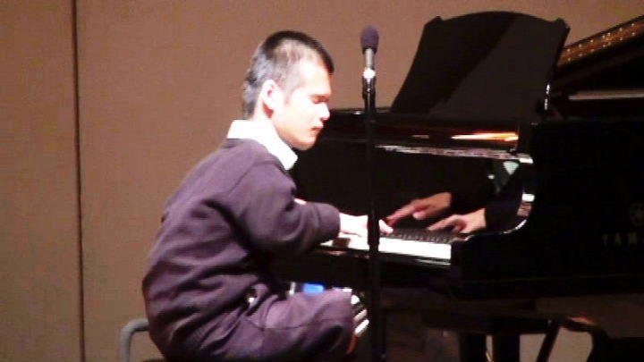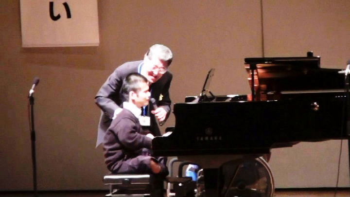 次に、大類氏の司会でピアノ演奏をする古西夜香さんが紹介された。古西さんは視覚と下肢の重度障害者で、演奏の際はペダルを膝で押さえることのできる器具を設置し、ビートルズやダイアナロス等のナンバーを披露した。テンポよく流れるような演奏は、聴衆の心をつかみ満場の拍手でした。また厳しいハンデを克服している19歳の若者の姿に私達は感動した。(出演者はボランティア)