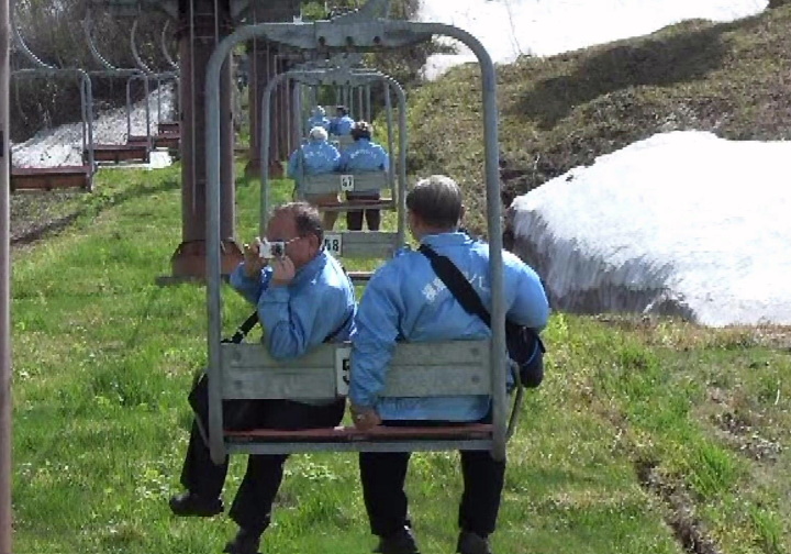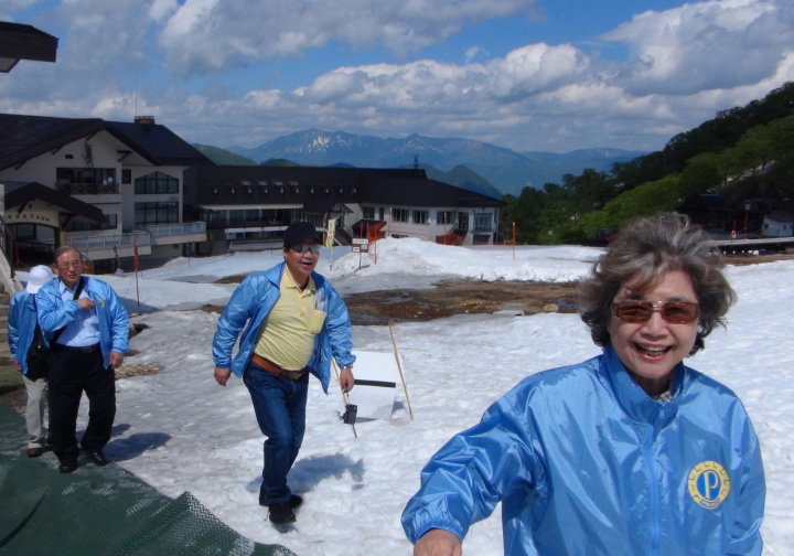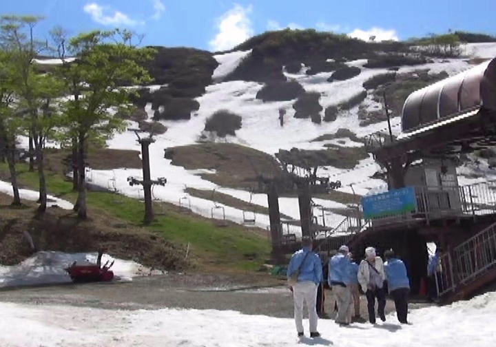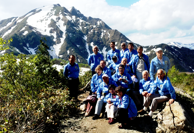 | 時間遅れの谷川岳ドライブインの昼食は、赤城牛がうまくウエイトレスさんも素敵で、全員皆満足。次に谷川岳ロープウェイの土合口駅(標高746m)まで向かい、ロープウェイで天神平駅(1319m)まで10分、約570mの高さを上った。かなり残雪が多かった。そこから、リフトで天神峠駅(1502m)まで7分、約180m上ったが、リフトの下を見ると、残雪から雪解け水が音を立てて流れ、雪が消えている地面には小さな蕗の葉が、湿地には水芭蕉も咲いていた。快晴。天神平、天神峠からの澄み渡った遮るものの無い眺望。残雪の残る谷川岳の神々しい山並みに、感激した、感激したと繰り返す会員もいた。谷川岳は厳しい地形と気象で遭難者が多いいことで知られているが、微塵も見せない美しい姿だった。ただ、M氏の兄が40年も前に遭難されたことを伺って、合掌 |
