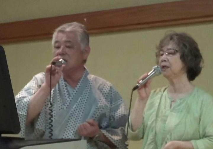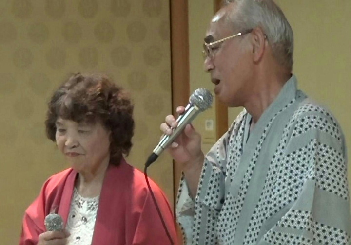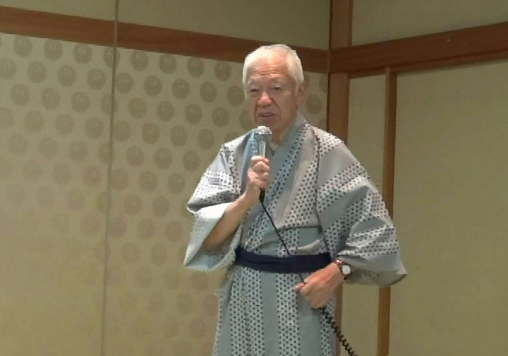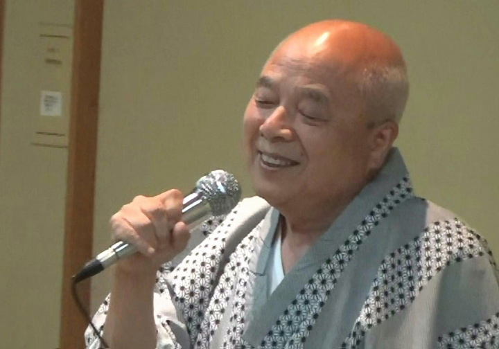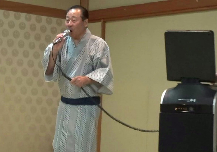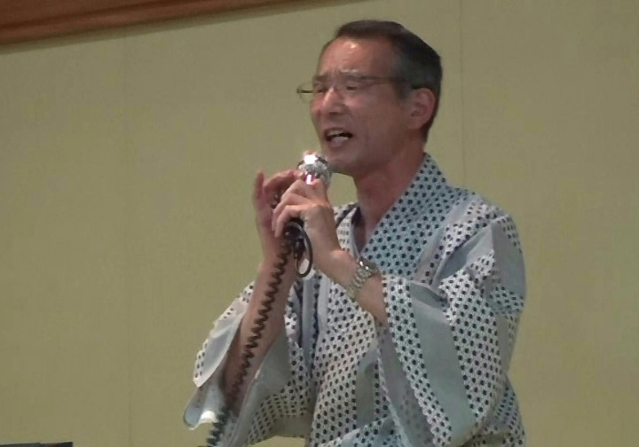夕食・懇親会は定刻に始まり、会長の挨拶、乾杯後しばらく食事を摂りながら懇談。いよいよ平野氏の司会でカラオケ等隠し芸大会の始まり、会長も含めみんなが参加。目をつぶっていると、司会者の蜂蜜に砂糖をまぶした様な甘い声にマスク? それに応える20代?ともとれる女性の嬌声など。全員が弾けて歌に踊りに大盛り上がりだった