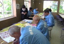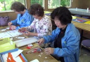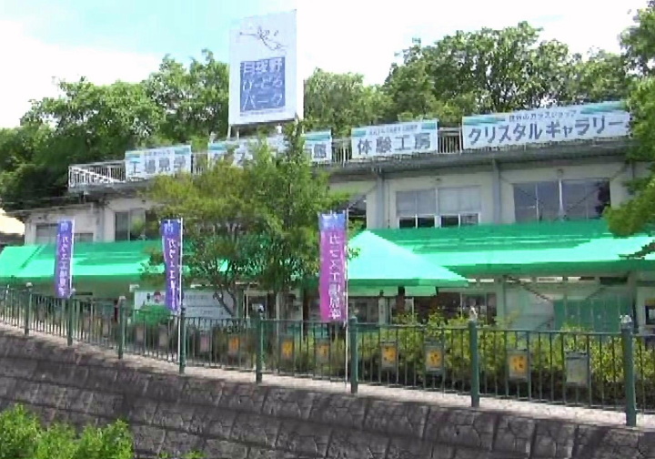 5~6分で道の駅。30分程度買い物時間をとって、次の月夜野びーどろパークへ。ガラス工作体験では、①透明ガラスコップにシールを貼って、その上から研磨砂を吹き付け、シール面だけ透明で残す。17名参加。②透明ガラス板に絵付けする。2名参加。