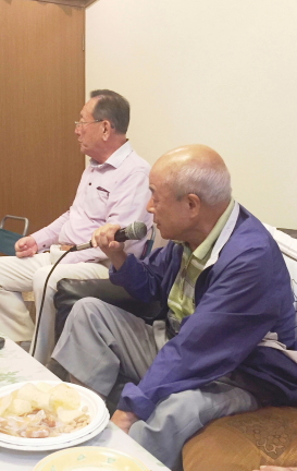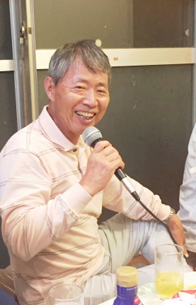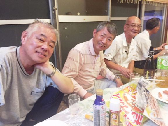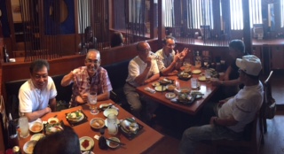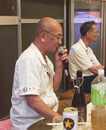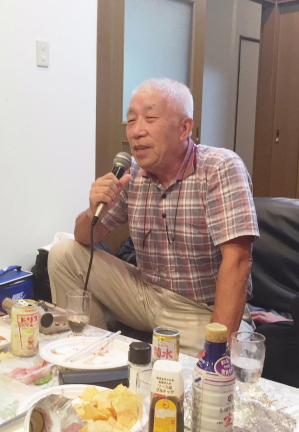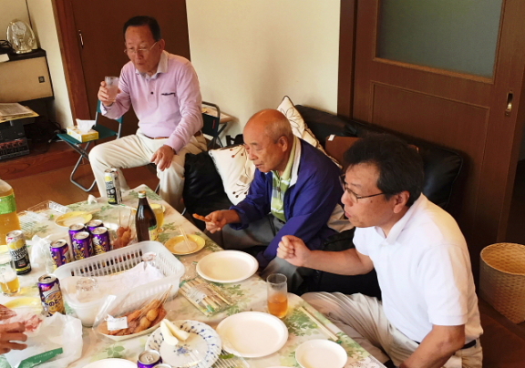 その中で皆さん、須藤、松下両シェフのもてなし料理と好みのアルコール等の飲み物を摂りながら懇親を深めた。3時半頃お開き、めいめい笑顔で帰路に就いた。ちなみに大好評だったメニューをご披露すると、牛バラカルビ焼き、豚バラ丸ごとホイール焼き、アサリ酒蒸し、鶏もも 焼き鳥、ゴーヤチャンプル、マイワシのフライ、松茸の生食、山芋の千切り、野菜サラダ等々。なお、 現場で急きよ不足した食材、燃料は、小西さんがバイクで買い出しに行って確保した。