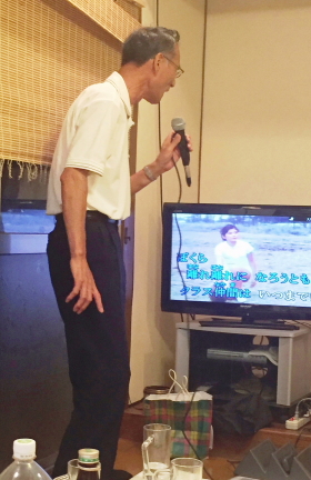 待ちに待ったカラオケ大会がスタ-ト 外の雨も気にせず、飲めや歌えやで延々深夜まで。時計が翌日を示した頃、ご近所からの「ソロソロ美声をお控えになっては・・・」のご忠告で終宴。 |