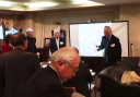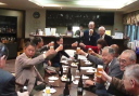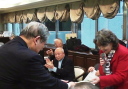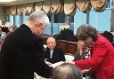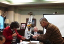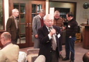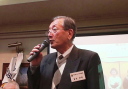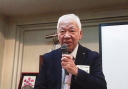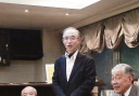 | 誕生月お祝い品贈呈 4月誕生3名 宮川清彦、平山秀樹、須藤照夫の各氏 (宮川、平山、須藤各氏が、謝辞を兼ねて一口スピーチを行った。) 本日ゲストの近藤会長も4月誕生なので、一緒に祝福。 |