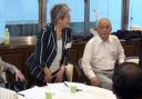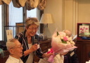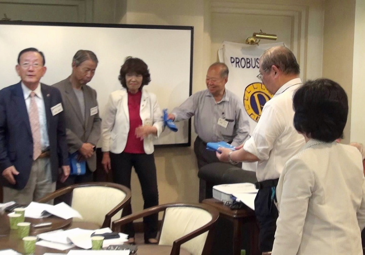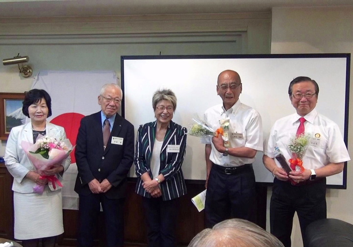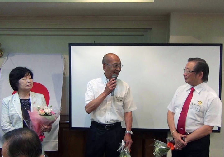 | 6月誕生月のお祝い品贈呈 該当者3名 保谷英雄 鈴木武道 岩城孝子 3名からそれぞれ謝辞があった。 (ロータリー近藤会長からサプライズ、岩城氏に花束贈呈があった。男性2名にもあり、思わぬプレゼントに大喜び。 さらに、感激した岩城氏からこの喜びを共にと、頂いた花束が会長にプレゼントされた。) |