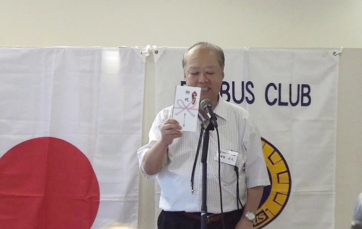 | 茶碗蒸付きの素晴らしい料理、ありがとうございます。先日の最終夜間例会には多数ご参加いただきお礼いたします。当日は東京の全国会議の議長で、例会遅参し失礼しました。また是非お出で下さい。こちらのクラブはメンバーも多く、山手RCも見習いたいと思います。皆様お知り合いがRC入会希望あれば、当横濱山手RCに入るようお勧め下さい。秋にはPCの全国大会も開催とのこと、一層のご発展をお祈りします。 |