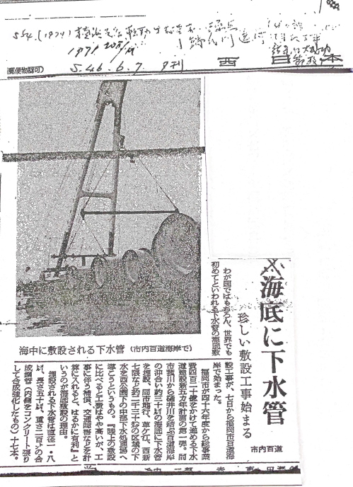 ・20代、九州福岡勤務時の経験;「海底に下水管 珍しい敷設工事始まる 福岡市百道海岸」(S.46.6.7 西日本新聞) この記事にもある通り、直径1.8m、長さ50メートル、200トンの下水管17本の敷設工事を五洋建設が請け負うことになり担当したが、下水管の規模を間違えて大変なことになった。