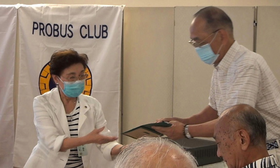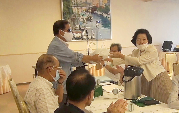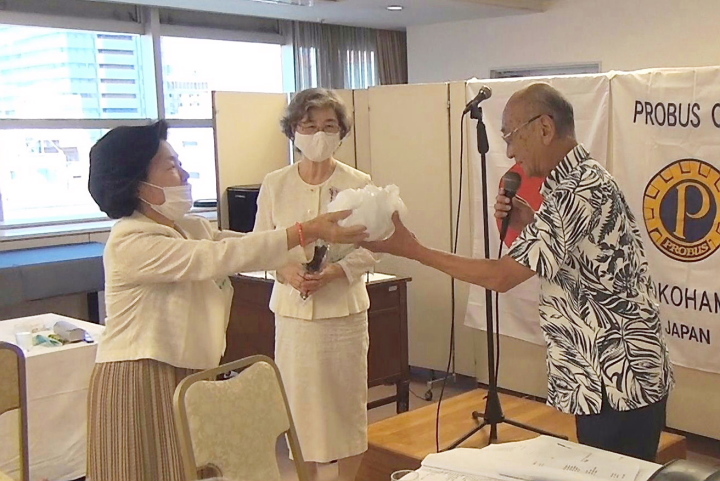 | 閉会後 岩城会員から 束野前会長 保谷前幹事 松下事務局 に コロナの為、3か月伸びた役員交代に感謝の品物を贈呈 |