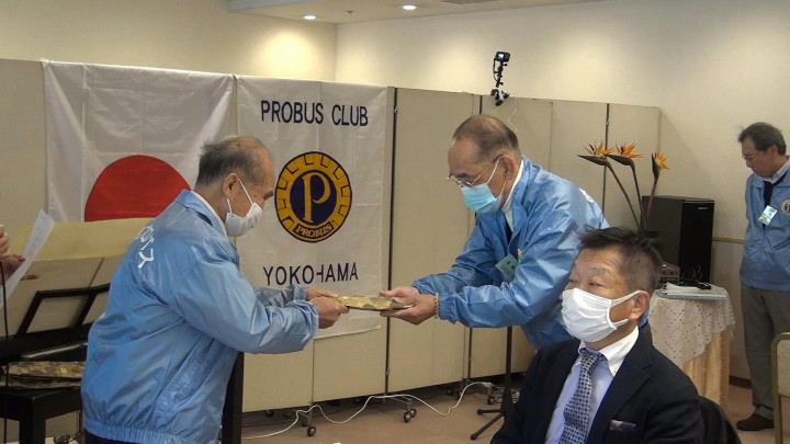 12月誕生の加藤豊会員、岡部会員、荻原会員に会長からお祝い贈呈。