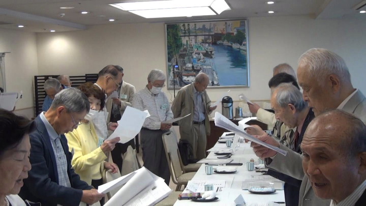 12 月の歌「背くらべ」;富永会員の指導で合唱